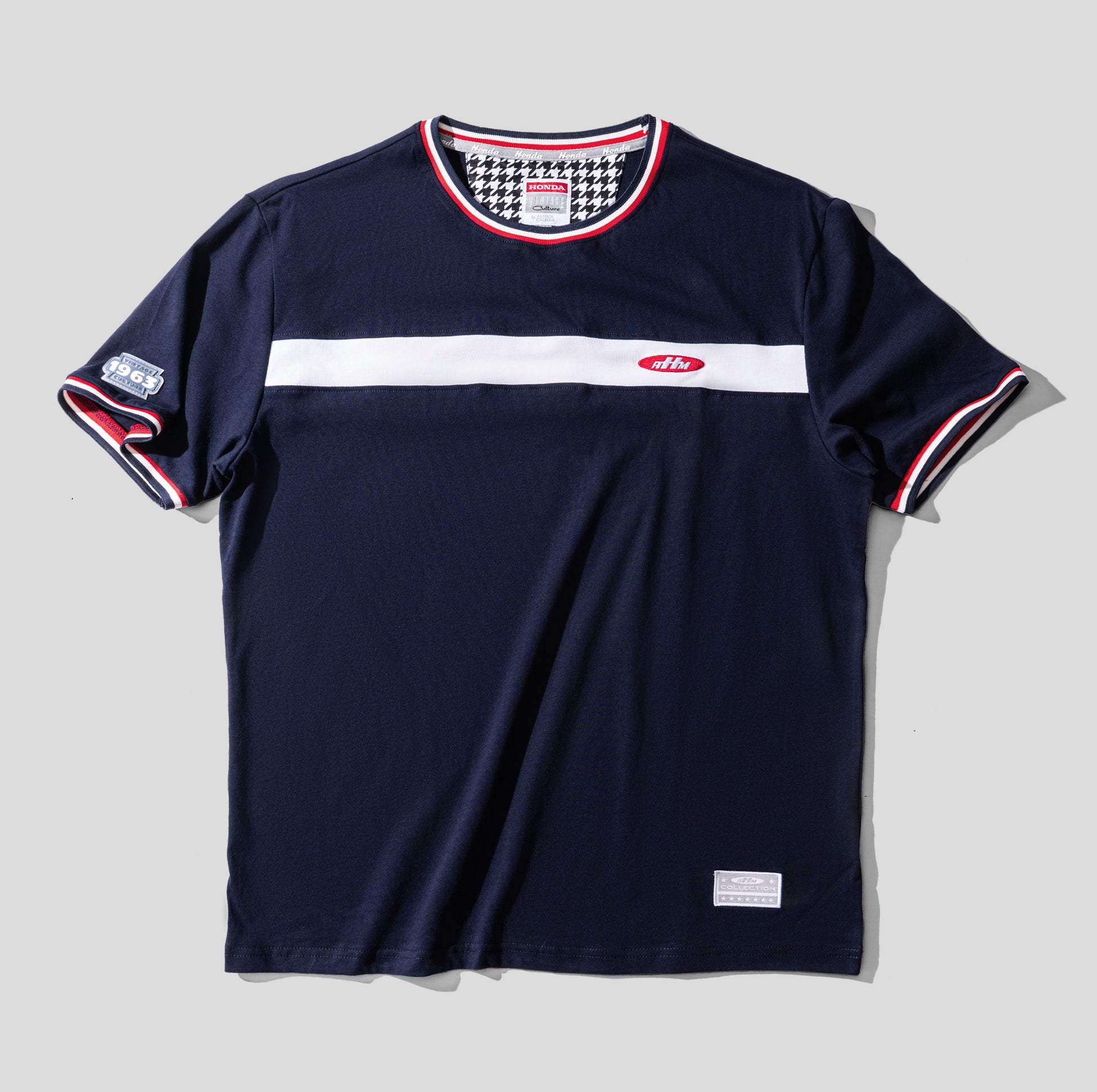 This premium red, white and blue ringer tee features printed branding exclusive to American Honda, a classic, houndstooth neck panel, detailed chest embroidery and bespoke AHM Collection labeling.