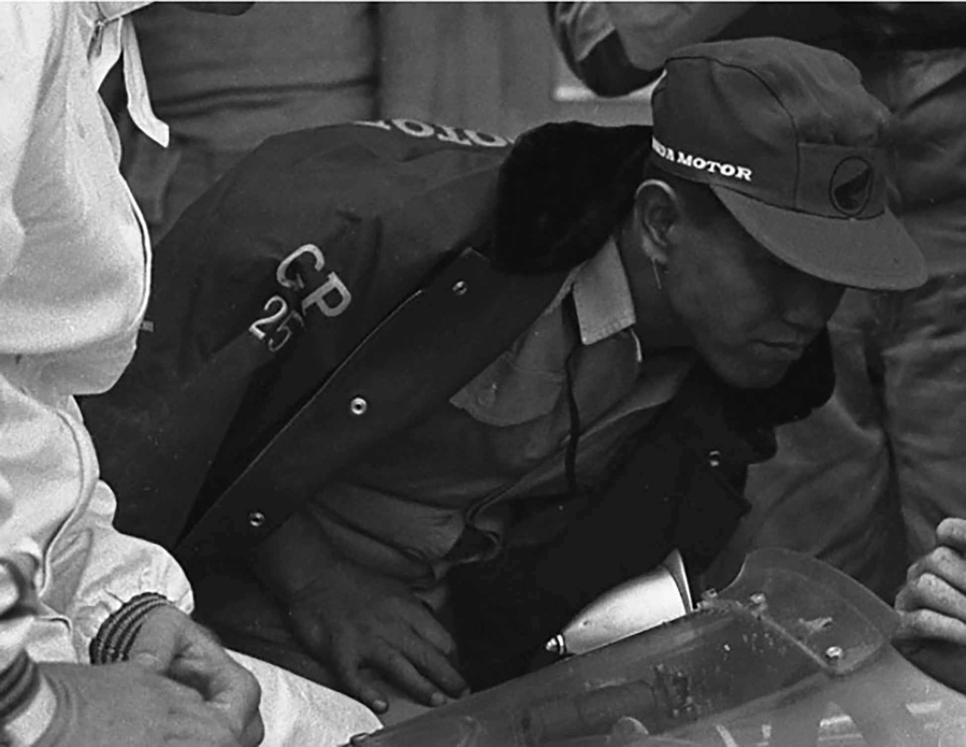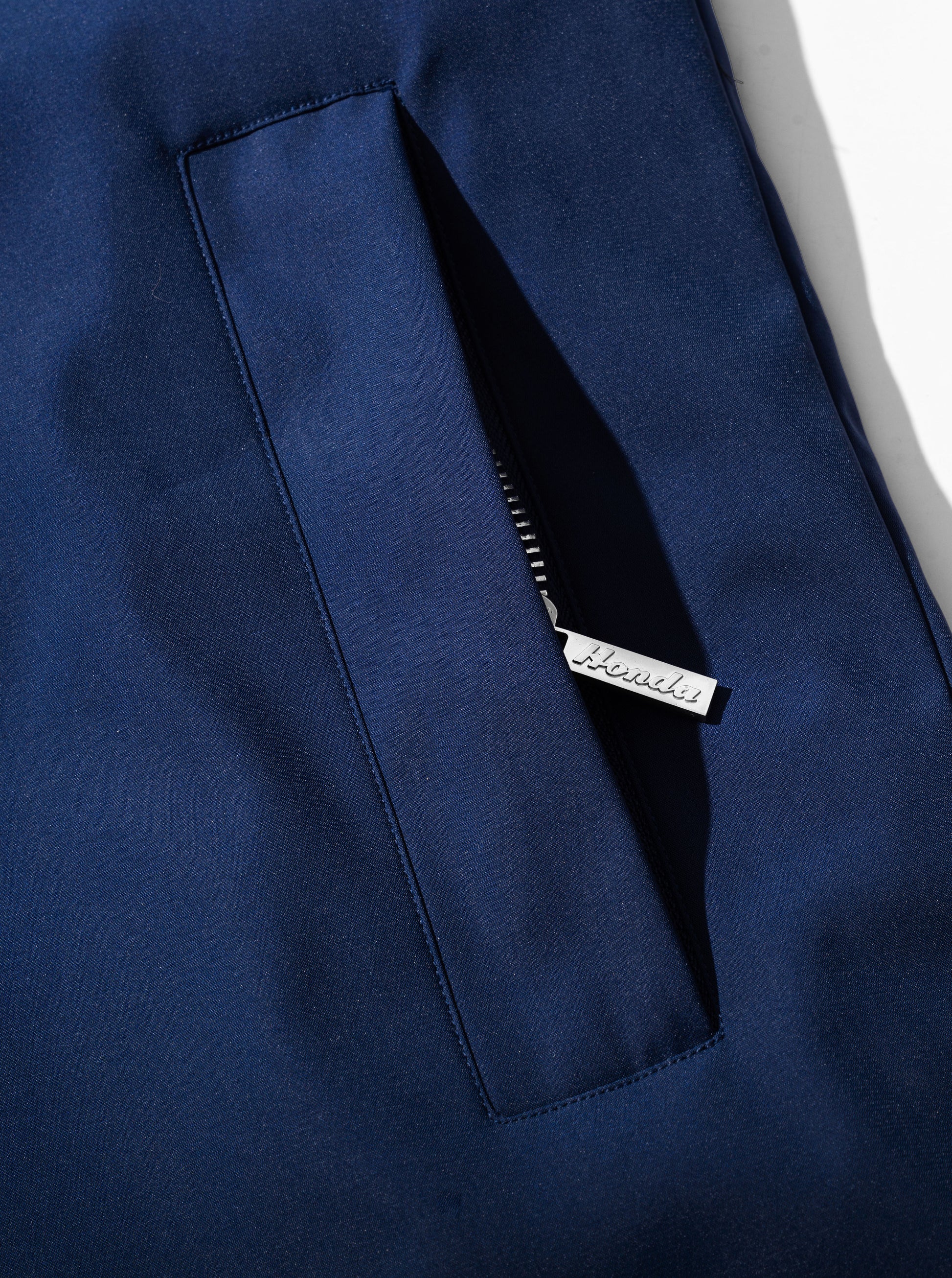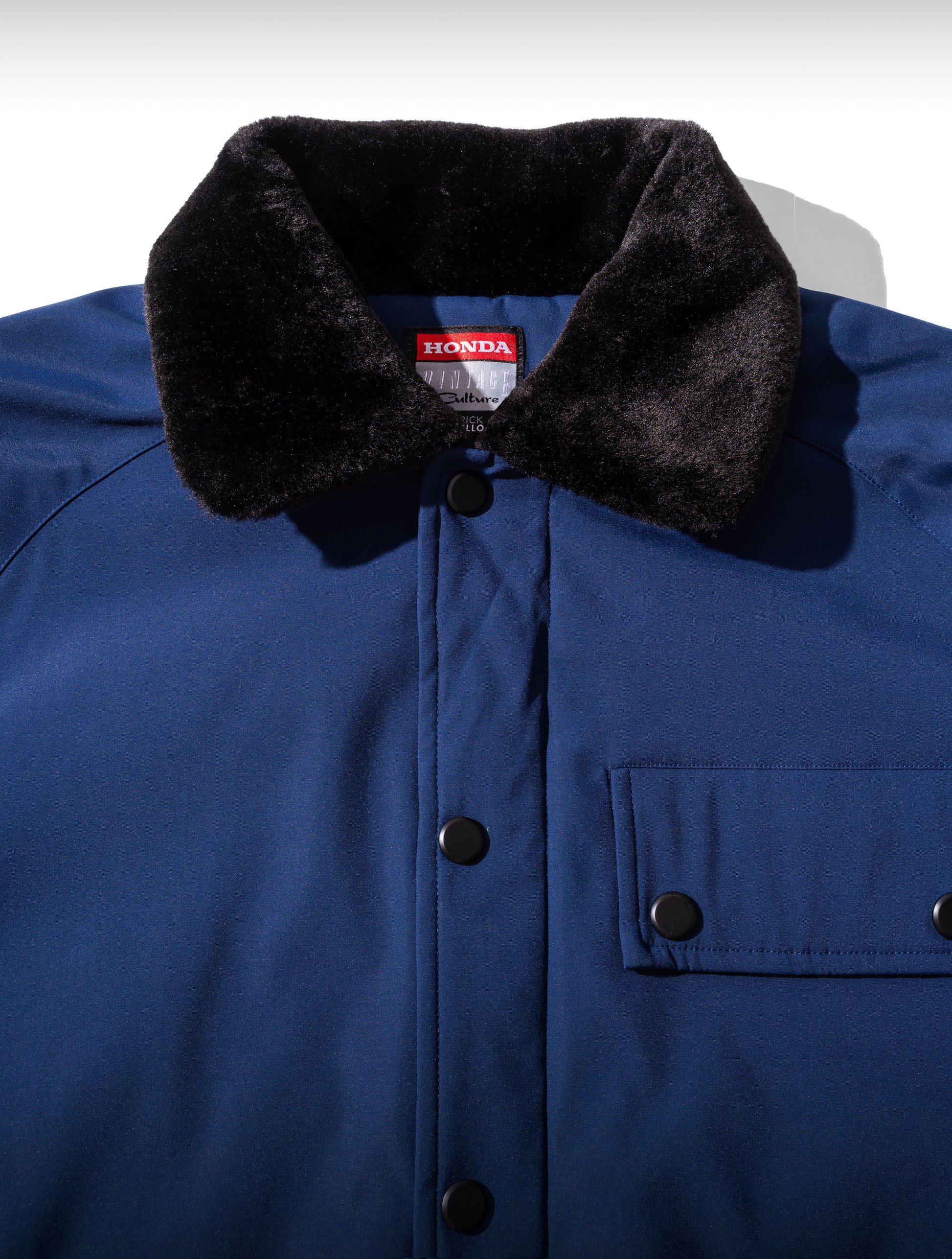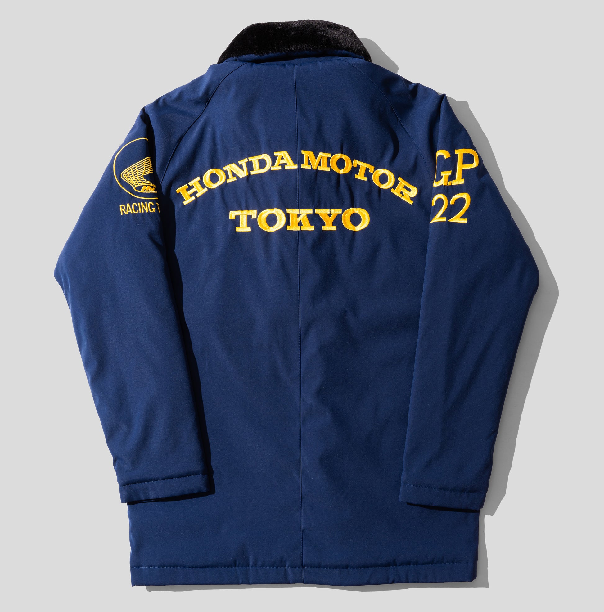 A highly detailed replica of the 1965 Honda F1 team jacket, painstakingly recreated from dozens of vintage photos. A simple "worker-style" jacket, with a vintage fit, featuring a faux fur collar, embroidered vintage branding, bespoke zipper pullers and quilted nylon-lining.