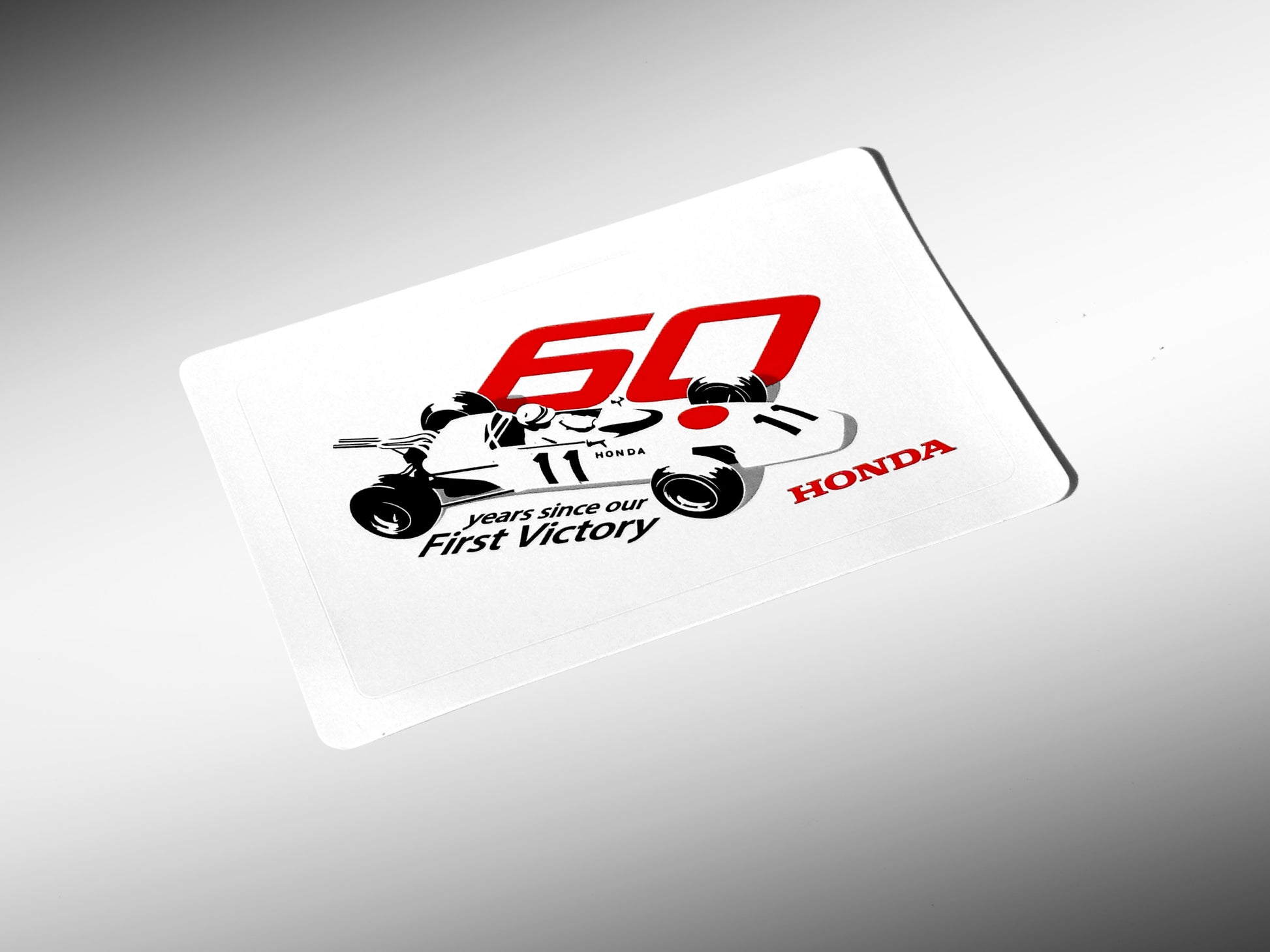 The official Honda F1 60th Anniversary First Win logo, designed by Honda Motor Co., LTD. Sticker uses premium adhesives and comes packaged in a resealable pouch.